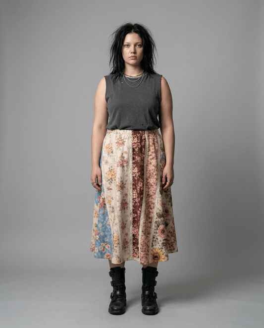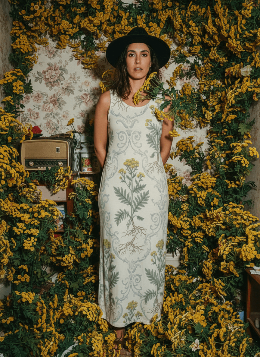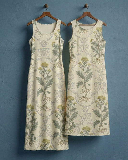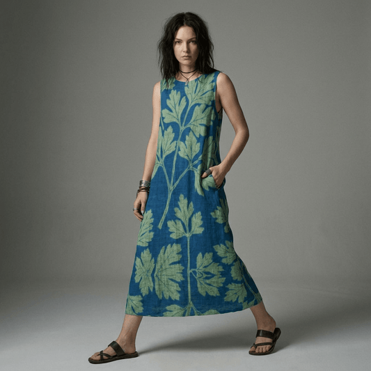 Slub cotton, like linen but rougher. Sleeveless. Wide, long A-line Best on taller frames.
