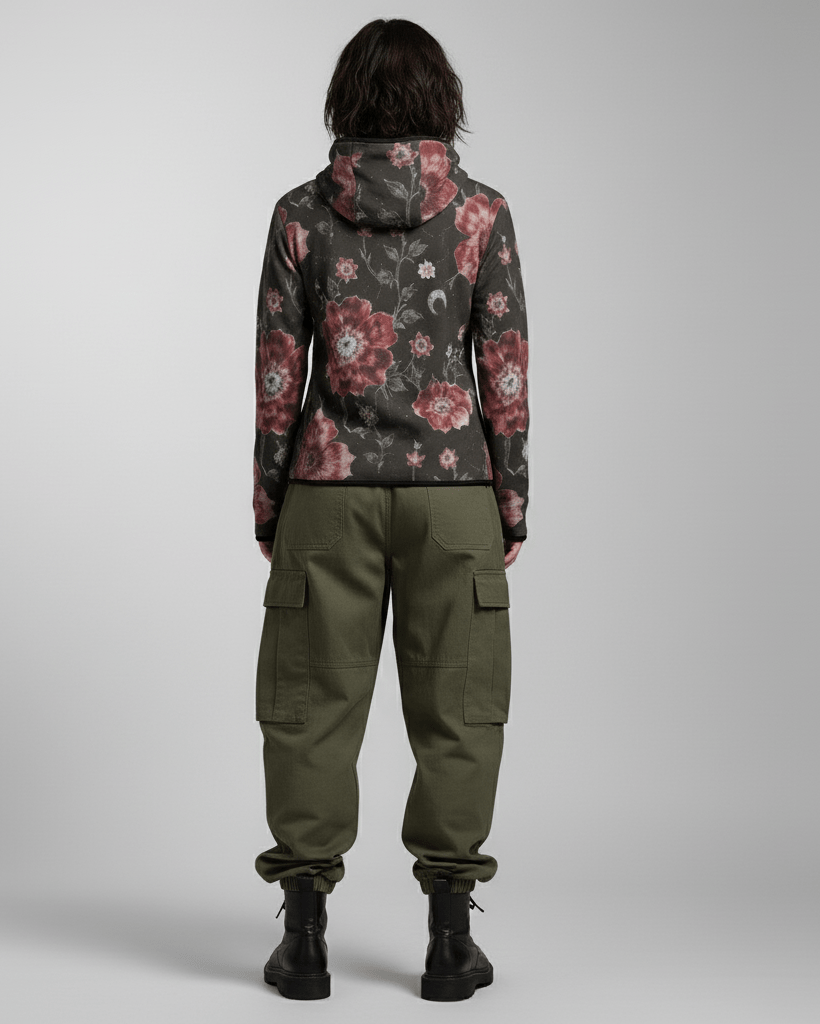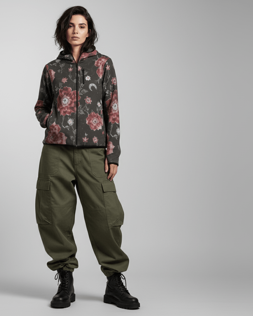 This hoodie holds that mood—dark florals stretched over a high-collar shell with thumb holes for grip. Flexible, warm, and built for layering, it shifts easily from street to stage, night to morning.
