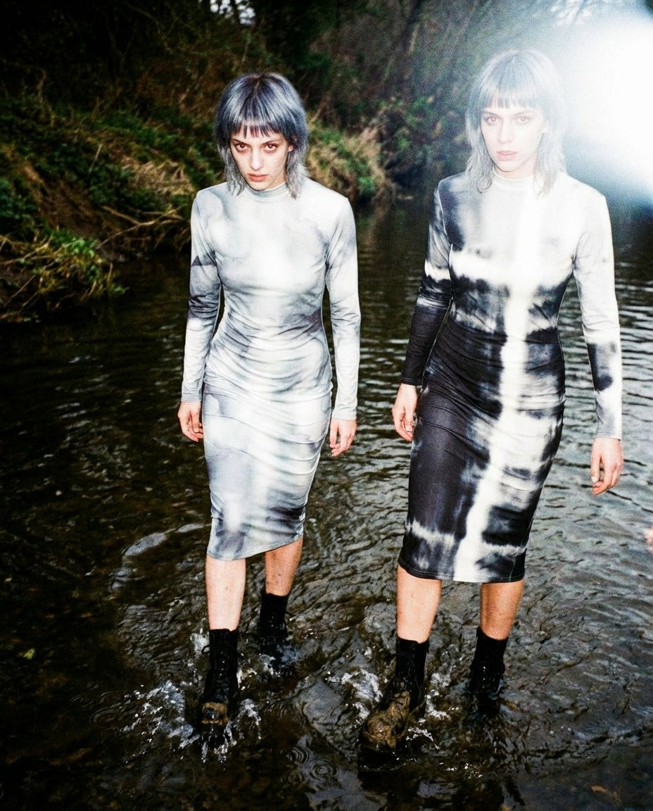 A long-sleeve turtleneck, cut close to the body. Printed in vertical currents — blurred, pulled, slightly unstable. The surface feels in motion, even at rest. Rendered in charcoal and bone on a soft scuba. Smooth, dense, and quietly structured. From our riff on OXIS called SPECIMEN. The body held inside the flow.