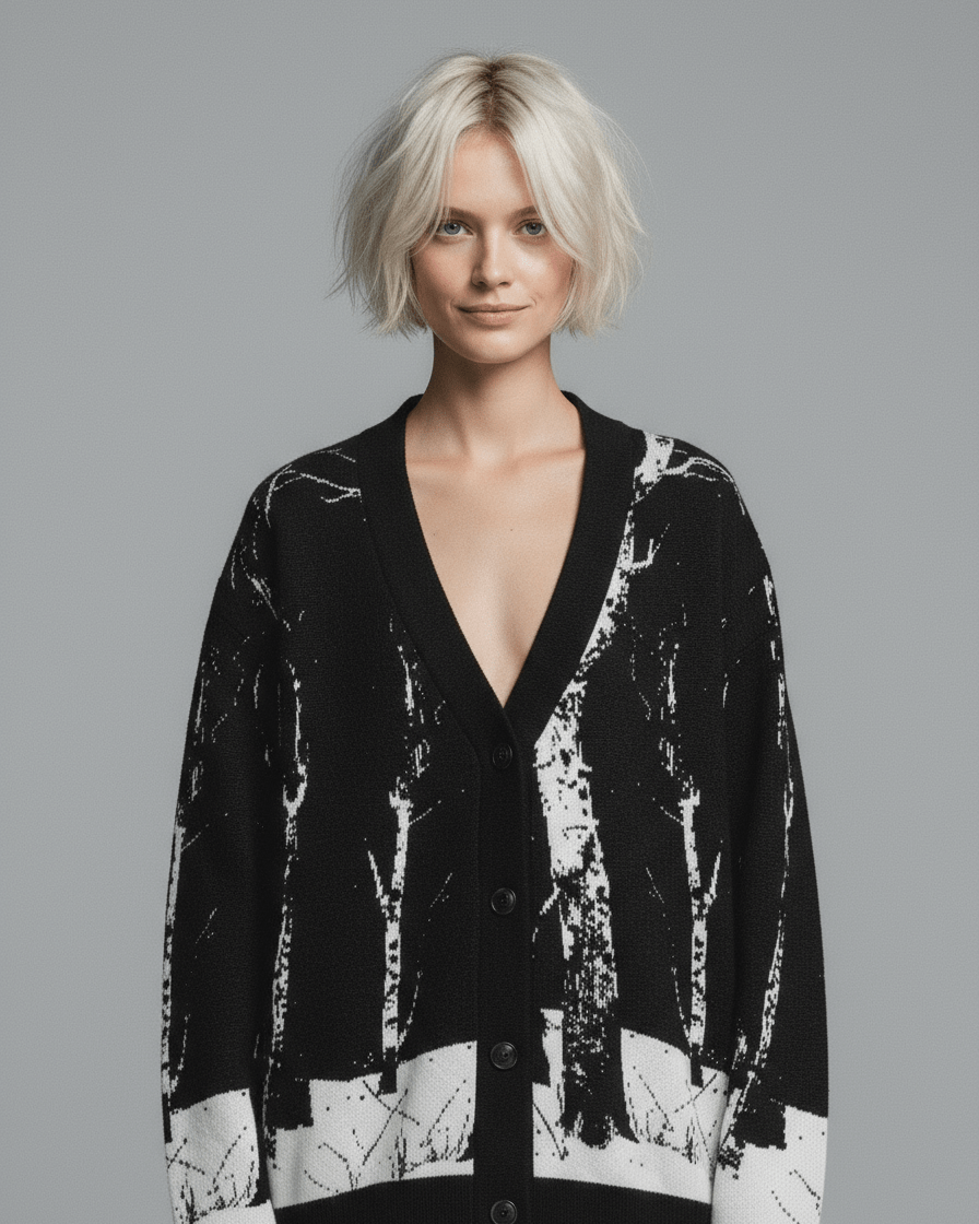 This jacquard knit drapes loose, like winter’s last breath — soft, heavy enough to hold, light enough to haunt.