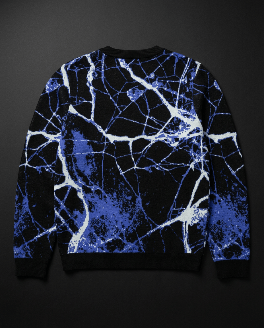 This knit crew flashes with electric blue branches across black — like the forest struck awake under aurora skies.