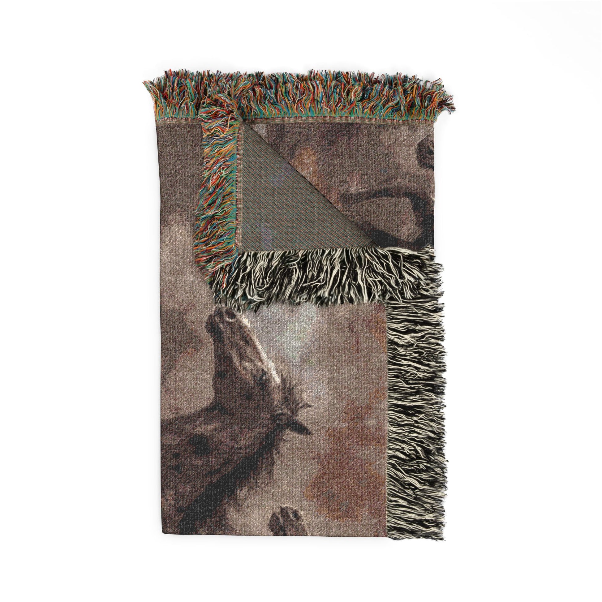 The image is woven, not printed. Threads carry the landscape the way memory does, slightly blurred, slightly heavy. The fringe lets the scene unravel at the edges, like wind pulling at fabric on an open hill.