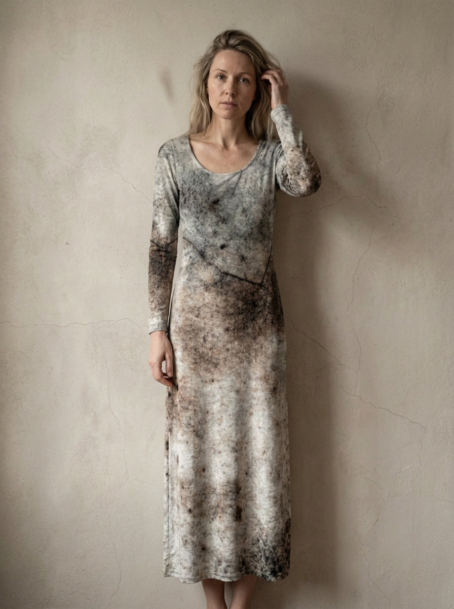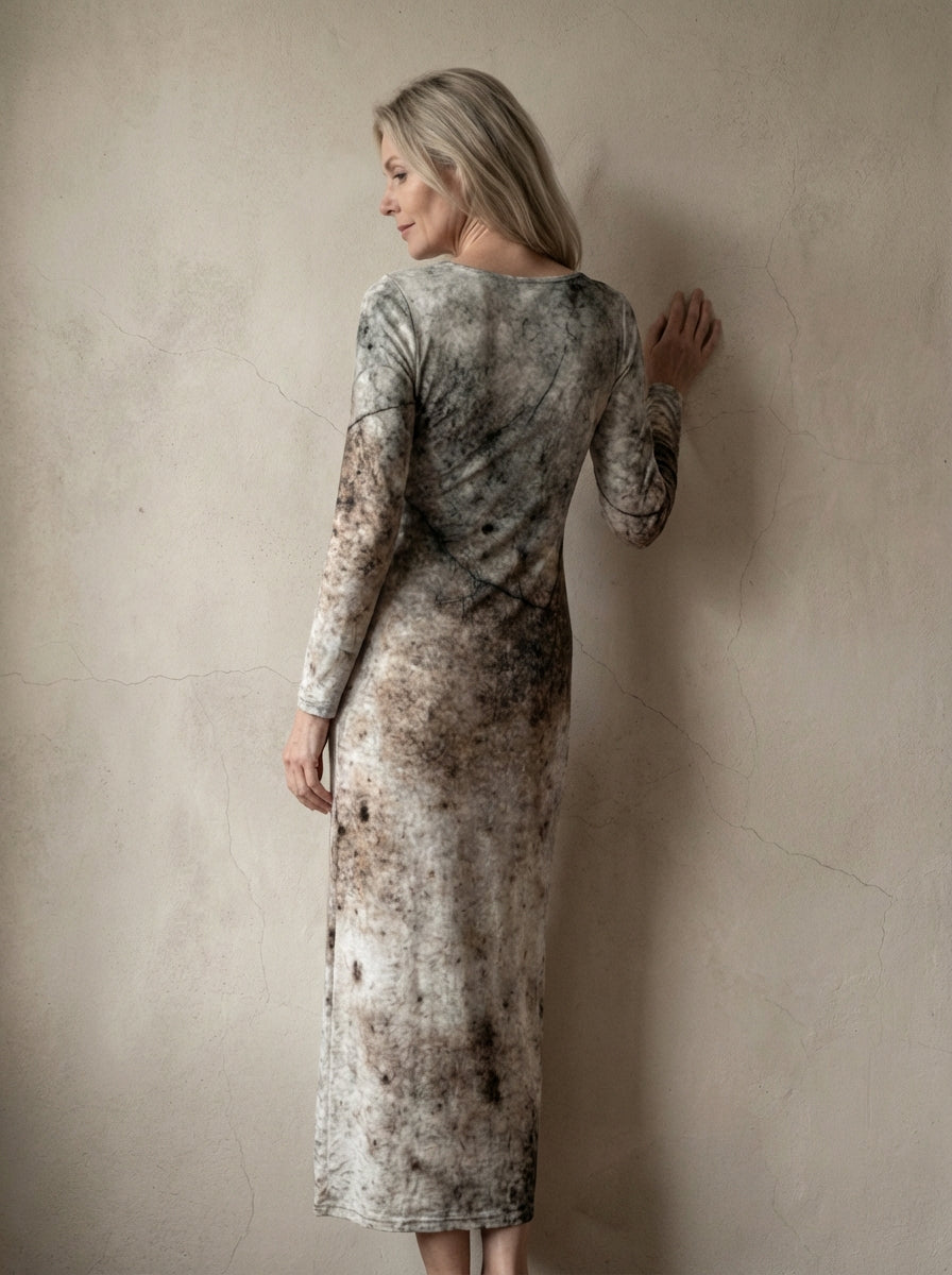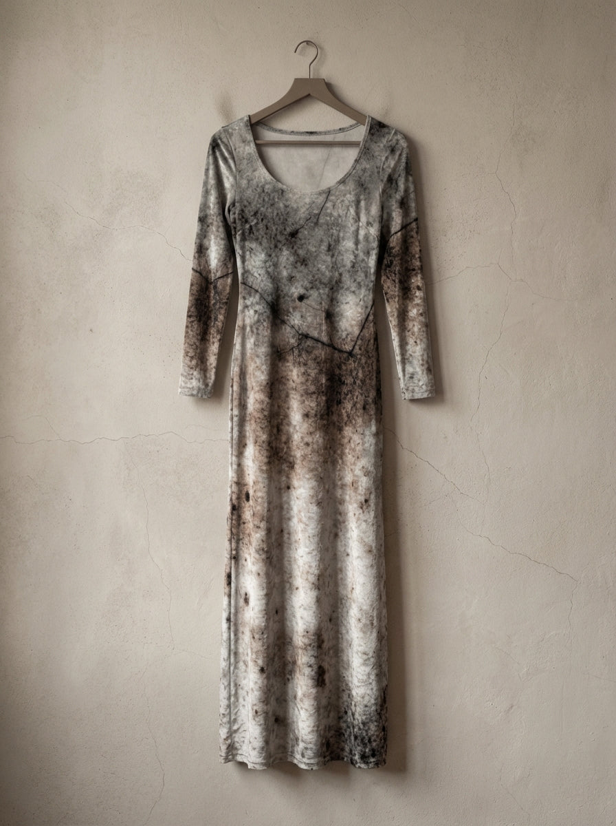 Not in a tragic way. In a chosen way. A long-sleeve velvet dress washed in dirty bone, peat, and wet leaf tones. The surface feels environmental, like fabric that absorbed a landscape rather than a printed motif. Soft crushed velvet catches light unevenly, shifting between fog, shadow, and skin. Scoop neckline. Long, silhouette with pockets.