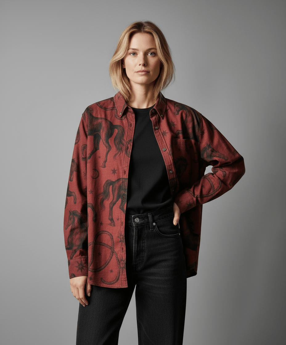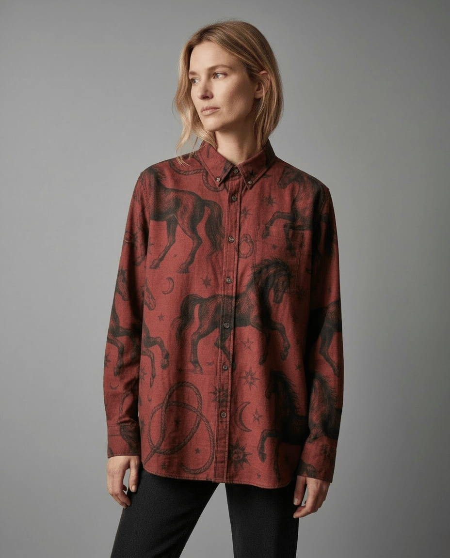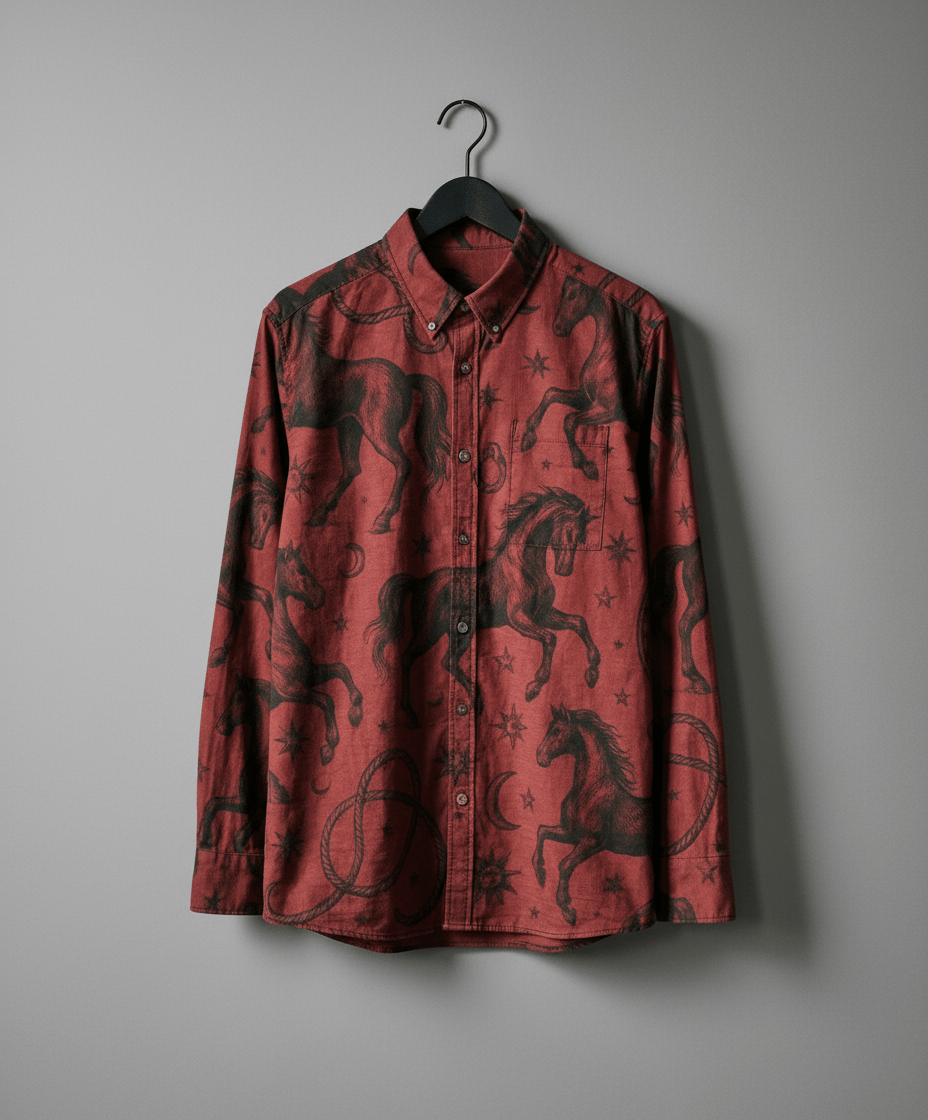 Year of the Horse shirt from the Everybody Scream Riff. POSSESSED STALLION is a structured Field Cut shirt in textured slub, carrying weight without heaviness.