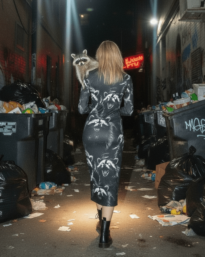 The Raccoon motif returns here, but sharper—shadowed, stretched, mirrored. It’s about curiosity in captivity, the holy mischief of sneaking light into dark rooms. Smooth microfiber, second-skin stretch like Scuba.
