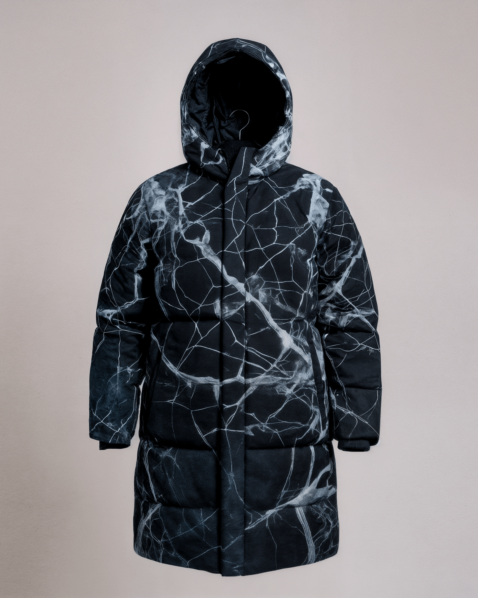 This long puffer seals in heat while the cracked-ice print fractures its surface. Hidden strength: feather and down blend, elastic cuffs, snap and zipper closure. Outer shell blocks the wind, inner weight keeps you standing.
