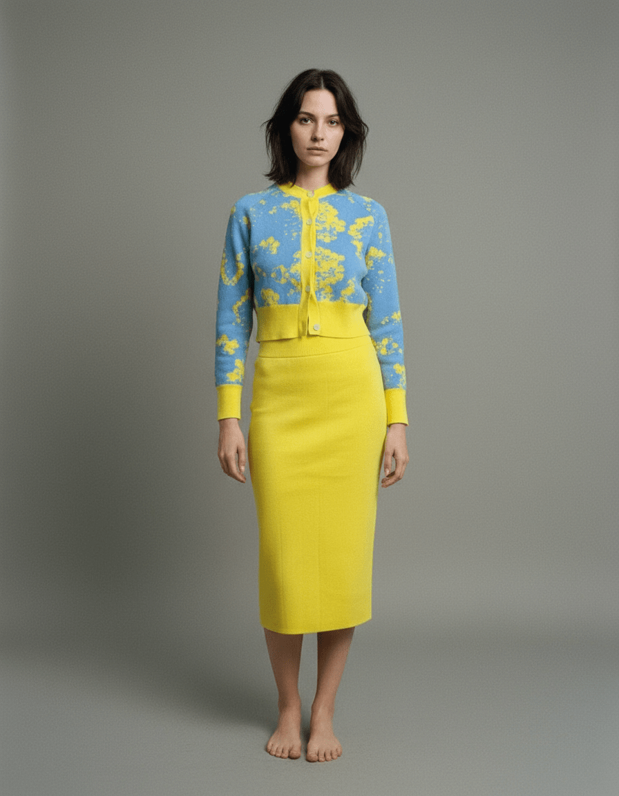 - Cropped knit cardigan in splattered neon yellow and digital blue